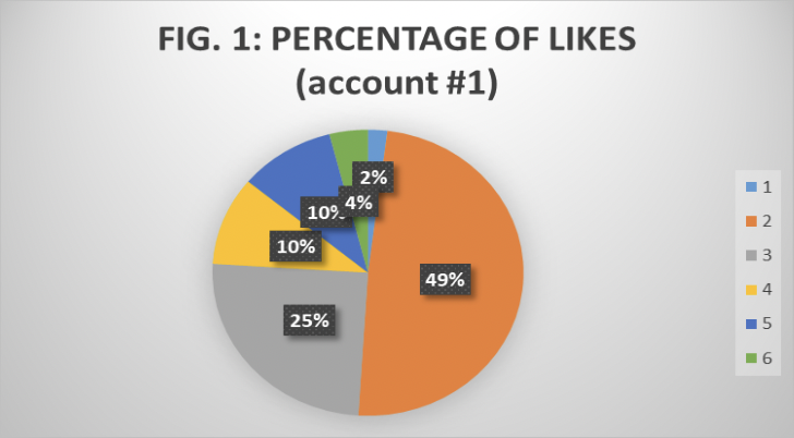Fig. 1: Percentage of likes (account #1): 0-50 likes (1) = 2%; 50-100 likes (2) = 49%; 100-150 likes (3) = 25%; 150-200 likes (4) = 10%; 200-250 likes (5) = 10%; more than 250 likes (6) = 4%. Created by the author.