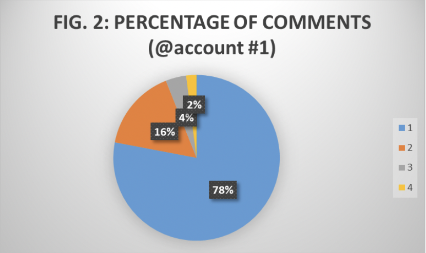Fig. 2: Percentage of comments (account #1): 0-5 comments (1) = 78%; 5-10 comments (2) = 16%; 10-20 comments (3) = 4%; 20-30 comments (N/A) = 0%; more than 30 comments (4) = 2%. Created by the author.