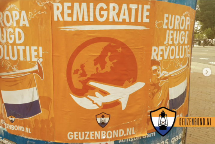 A significant portion of Geuzenbond’s activity on account #1 is dedicated to showcasing plaktivisme efforts in those provinces. Posts show white and orange stickers with Eurosceptic, militarist, ethnonationalist, and xenophobic slogans such as ‘Europa jeugd revolutie’ (transl. ‘Europe youth revolution’), ‘Nationalist, je bent niet alleen’ (transl: ‘Nationalist, you are not alone’), and ‘Remigratie’ (transl. ‘Remigration’). Most stickers feature the Prinsenvlag (transl. Prince’s flag), which is designed with three horizontal bands of orange, white, and blue. The flag was first displayed during the Eighty Years’ War (16th century) by William of Orange, but became associated with Nazism after its usage by the Dutch National Socialist Movement (NSB) prior to and during World War II.