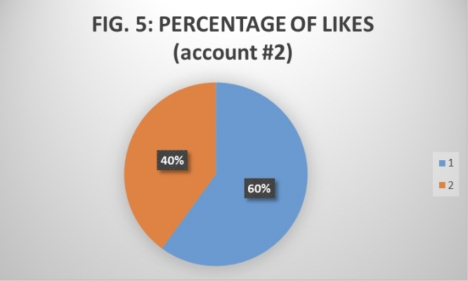 Fig. 5: Percentage of likes (account #2): 0-40 likes (1) = 60%; more than 40 likes (2) = 40%. Created by the author.