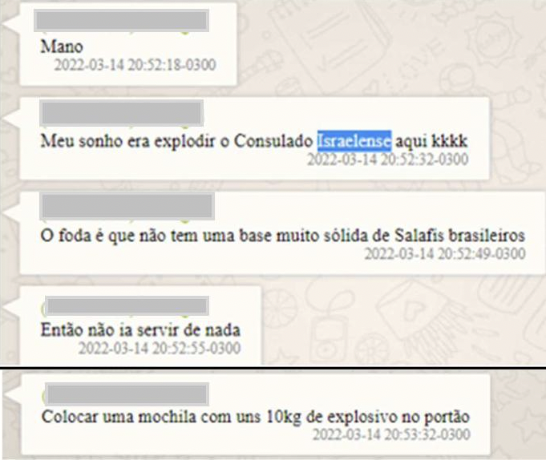 Figure 4: Planning on WhatsApp of the attack by a Brazilian and a minor against the Israeli Consulate in São Paulo (credit Brazilian Federal Police)