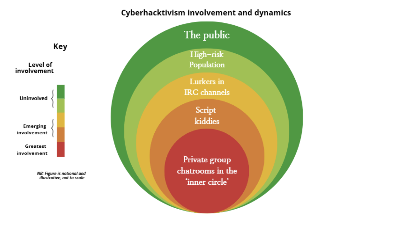 Figure 1: A visualisation of the spectrum of cyberhacktivist engagement. NB: The above figure is notional and illustrative, not to scale (graphic designed by the author).