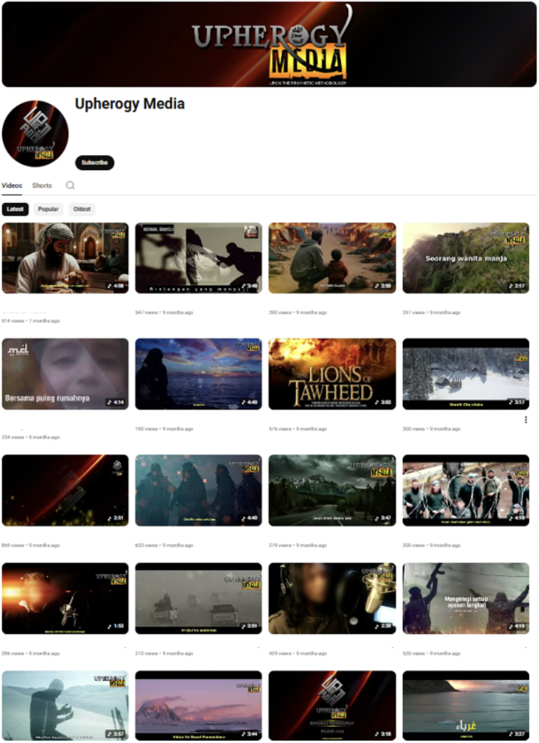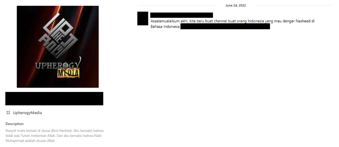 Upherogy Media (UM) emerged as an influential entity that systematically produced and distributed both original and linguistically adapted pro-IS nasheeds performed in Bahasa Indonesia within a demarcated online space. The now-defunct outlet surfaced on an IS-affiliated encrypted platform in 2022 and directed users to join its dedicated channel (Fig. 1 and 2).