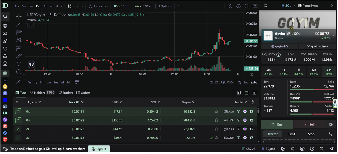 When GOYIM was launched on 1 February on the Solana blockchain, like many meme tokens, it became tradable immediately through a publicly available contract address. Anyone with access to a crypto wallet could buy or sell it within minutes of launch. This decentralised phase imposes no constraints on naming or ideological framing, since tokens enter the system through a technical process and are not evaluated as ordinary products are.