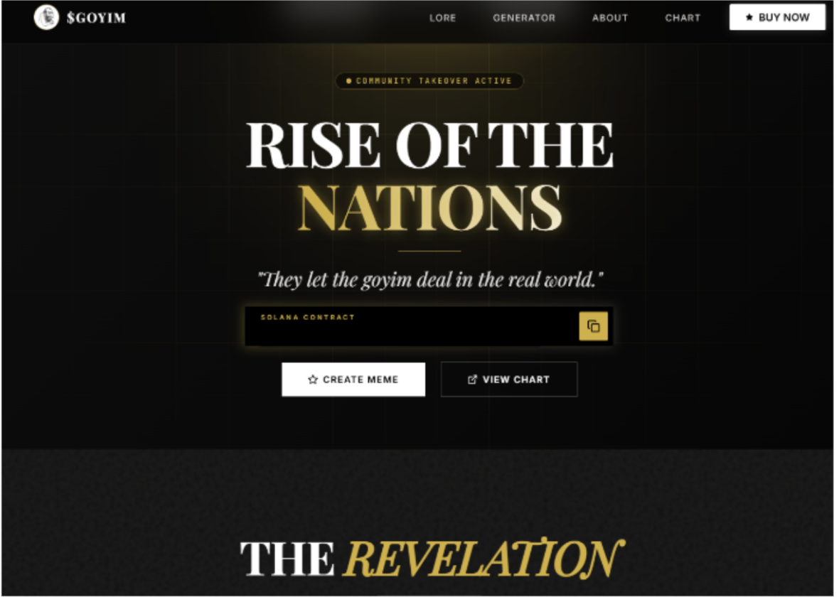 The project’s visual language is visible before any discussion of the token. The GOYIM website homepage displays a stereotype caricature associated with antisemitic imagery. Positioned above the token’s name and central slogan “Rise of the Nations”. The image brands the token within an openly ideological context.