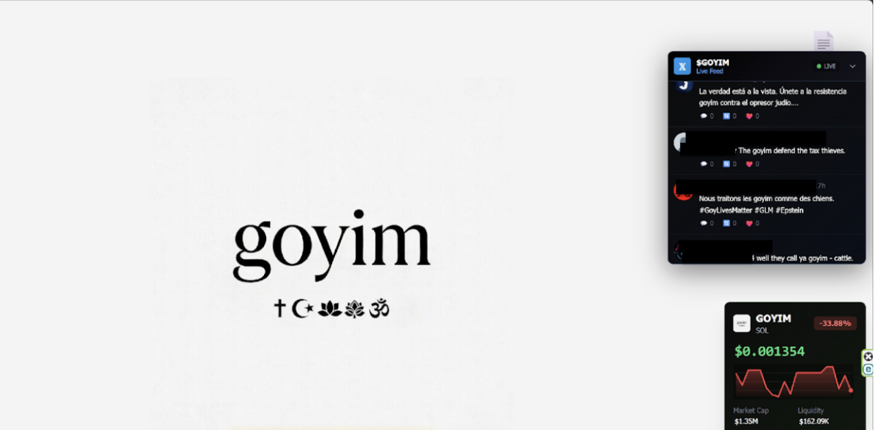 On 1 February 2026, a meme token called GOYIM appeared on the Solana blockchain, a public digital network where cryptocurrencies are created and traded. In contemporary far-right online spaces, the term appears in slogans such as “The Goyim Know”, promoting conspiracy theories of hidden Jewish control.