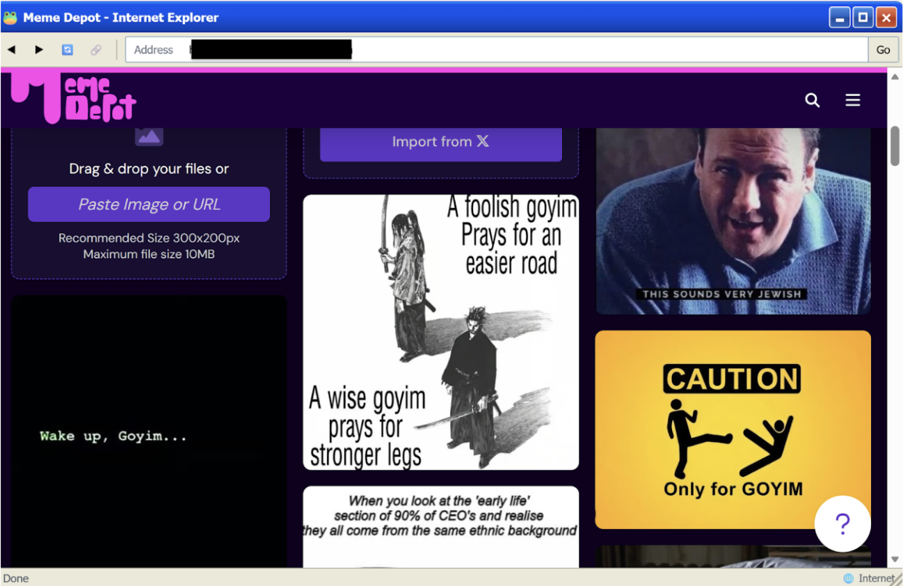 Other elements within the interface carry the same ideological message. A section titled “Meme Depot,” groups antisemitic memes directly on the project’s site.