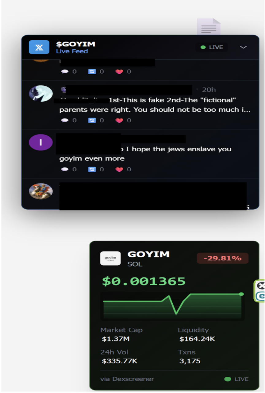 The launch of the GOYIM meme token shows how generative AI, platform design, social media circulation, and crypto market infrastructure operate together within a single project. The token’s website integrates a meme-generation tool that enables users to produce antisemitic content directly on the platform. The same interface provides access to live trading data and exchange services. An affiliated X account connects social media promotion to the token’s contract address and website, allowing users to move quickly from posts to trading.