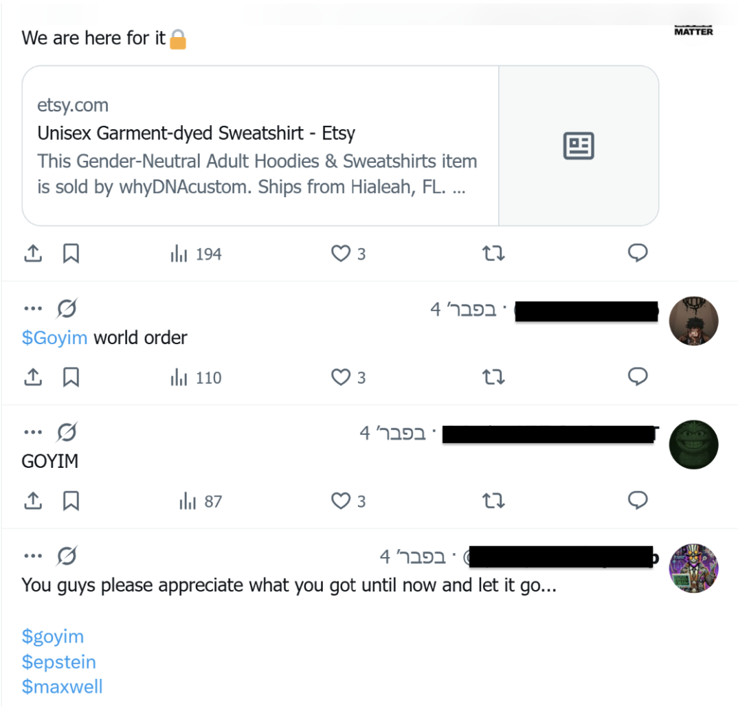 In early February 2026, the resurfacing of Epstein-related files was followed by a visible rise in antisemitic rhetoric online. Previously private correspondence and references to Jewish figures circulated widely on social platforms and were repeatedly used to support conspiratorial claims. GOYIM emerged during this period, drawing on the same language and symbols narrative.
