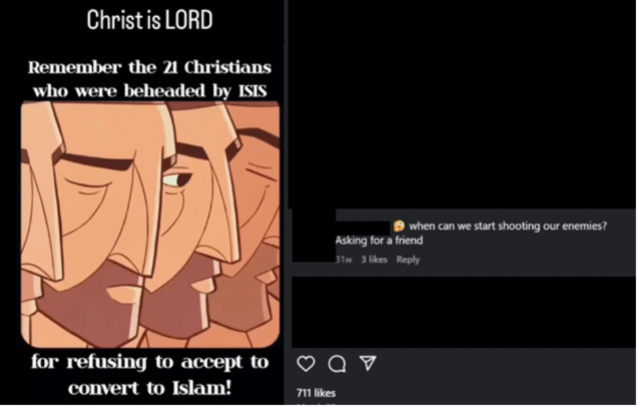 Figure 1: A screenshot from a 2025 post, from an Instagram profile that heavily posts Islamophobic and xenophobic content. Another user who regularly interacts with Canadian extremist content asks when they can shoot “enemies.”