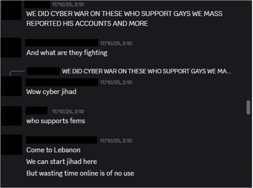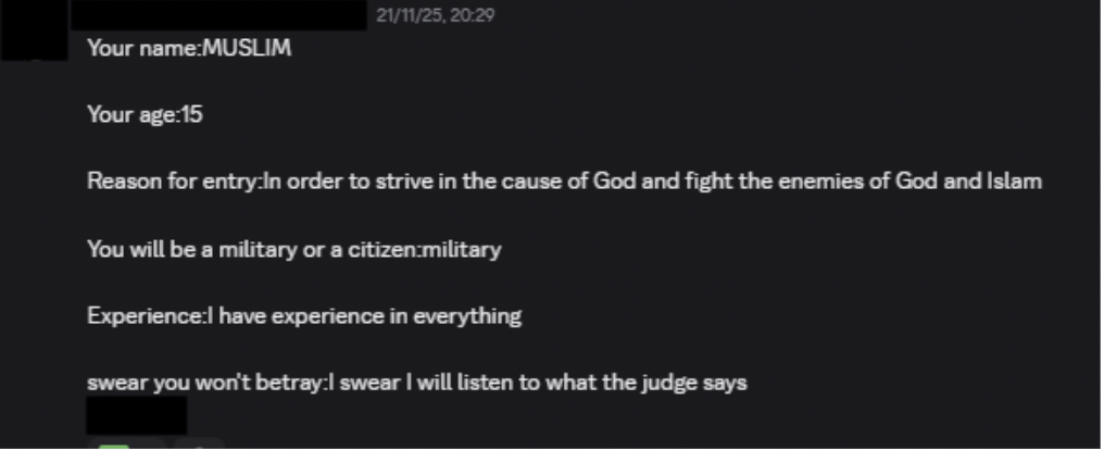 Communication within these servers is typically informal and highly interactive, reinforced by frequent use of voice chat. Within this environment, jihadist terminology such as kuffar or jihad may appear alongside non-religious content, integrated into everyday language, jokes, or in-game narratives. When detached from their original context, these terms become normalised within the group’s shared vocabulary, lowering moral and cognitive barriers to extremist references.