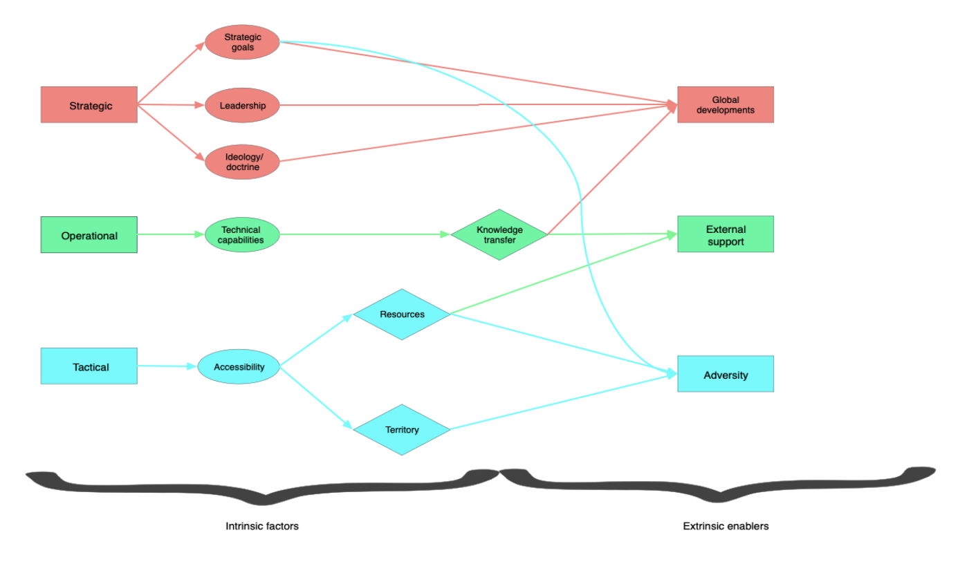Terrorist innovation is contingent upon intrinsic factors – factors internal and unique to a group – and extrinsic enablers – external catalysts that facilitate innovation and the adoption of technology. Both work in tandem to influence a terrorist group’s innovation calculus.