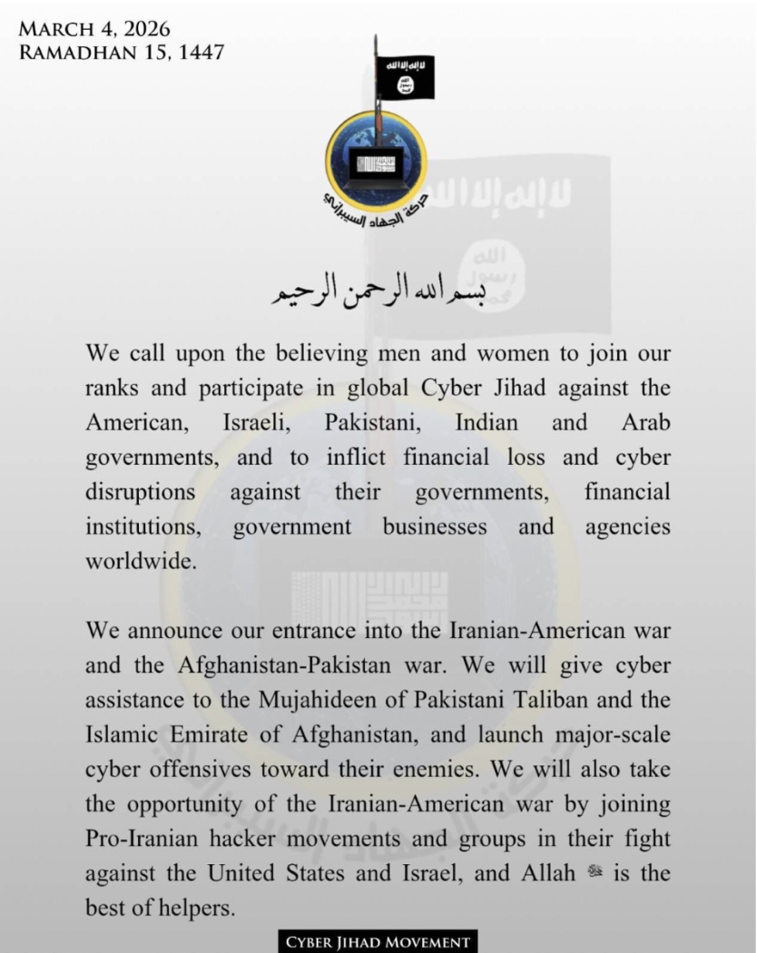 Image 1. Screenshot of the CJM communiqué dated 4 March 2026, calling upon believers worldwide to join Global Cyber Jihad against shared adversaries.