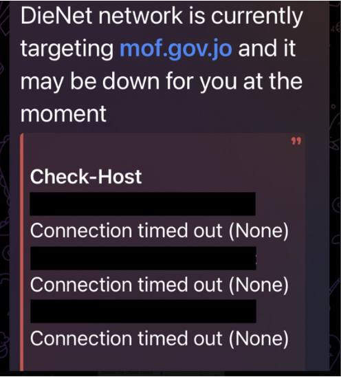 Image 2. Message on DieNet’s official group on Telegram, sent on the 3rd of March, where the group claims the targeting of Jordan’s Ministry of Finance’s website.