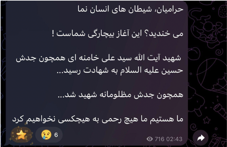 Image 3. Message on the “Cyber Fattah Team” group on Telegram, sent on the 1st of March. Translation: “Thieves, humanoid devils; Are you laughing? This is the beginning of your misery! Martyr Ayatollah Seyyed Ali Khamenei was martyred like his grandfather Hussein (peace be upon him)…Like his grandfather, he was martyred unjustly…We are here, we will show no mercy to anyone.”
