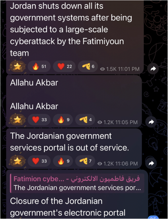 Image 5. Screenshot from the official “Fatimiyoun Cyber Team” group on Telegram, in which the group claims responsibility for the cyberattack on Jordanian government websites.