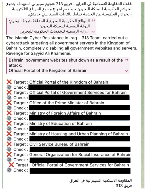 Image 6. Screenshot from the official “Islamic Cyber Resistance in Iraq – 313 Team” group on Telegram, claiming responsibility for the cyberattack against Bahrain.