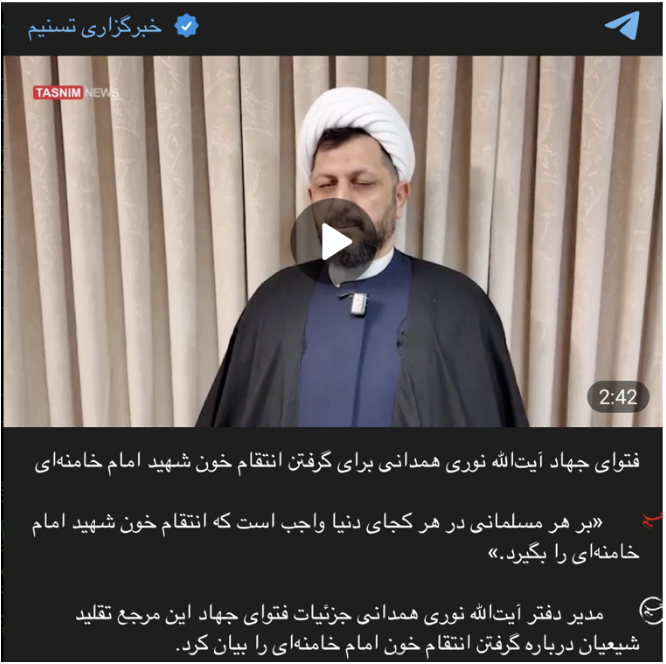 Image 7. Screenshot from an IRGC-affiliated Telegram channel amplifying Ayatollah Nouri Hamedani’s jihad fatwa. Translation: “Ayatollah Nouri Hamedani’s Jihad Fatwa to Avenge the Blood of Martyr Imam Khamenei. It is obligatory upon every Muslim, anywhere in the world, to avenge the blood of martyr Imam Khamenei. The director of the office of Ayatollah Nouri Hamedani explained the details of this Shiite religious authority’s. Jihad Fatwa to avenge the blood of Imam Khamenei”.