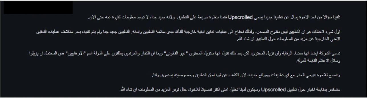 In early February, the non-institutional media outlet Ansar Electronic Security (AES) posted on its channels that it “received a question from one of our brothers about a new application called UpScrolled.” AES first emphasised that the application has been recently released, “so […] there is not much information about it.” The post emphasised that since UpScrolled is not “open source…, external security audits” would be needed in order to “ensure its safety and security.” Notably, AES highlighted that, even though UpScrolled claims to be “anti-censorship… it is likely that State-affiliated material will be removed.” On that basis, AES advised users “to be cautious with any new applications and websites, because it takes time to determine the strength of an application’s security and privacy features.” The media house concluded that it would monitor the news on UpScrolled and provide a more detailed security analysis as soon as more information becomes available (Figure 2).