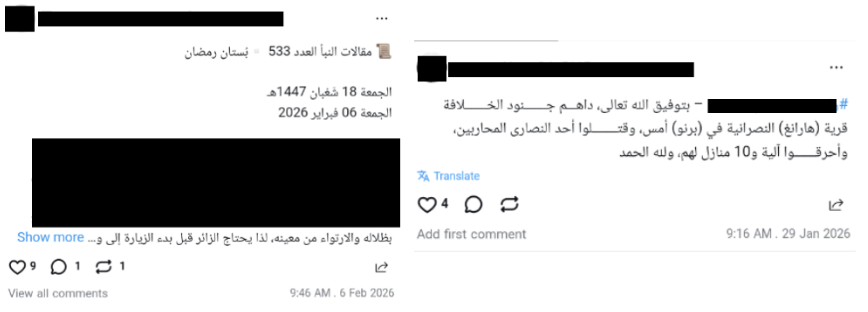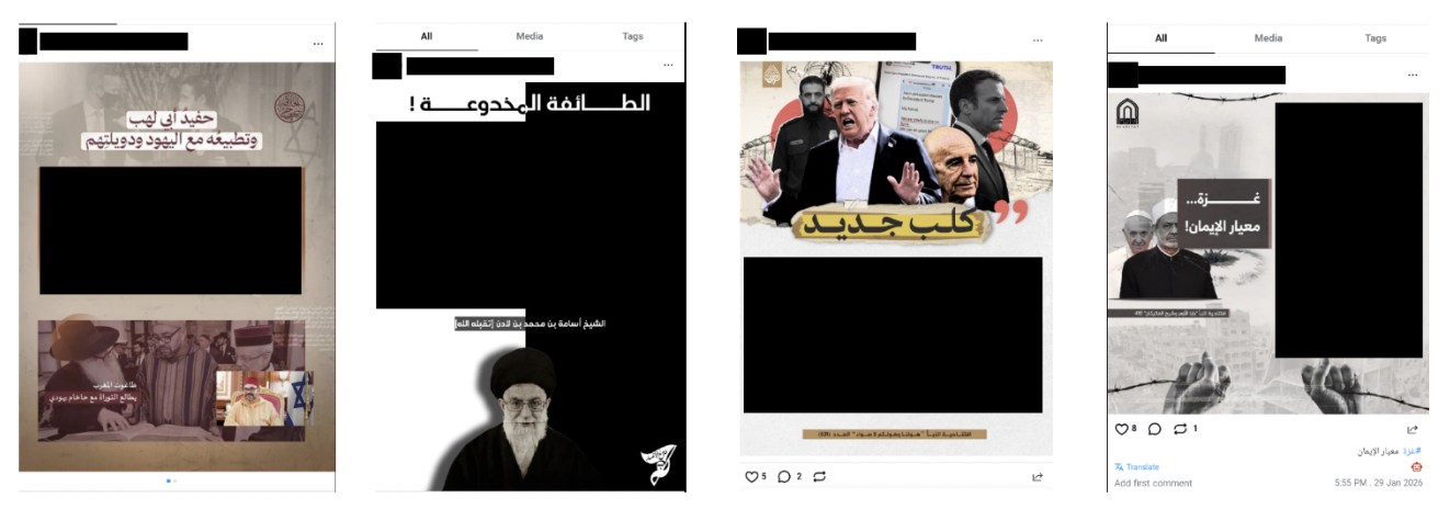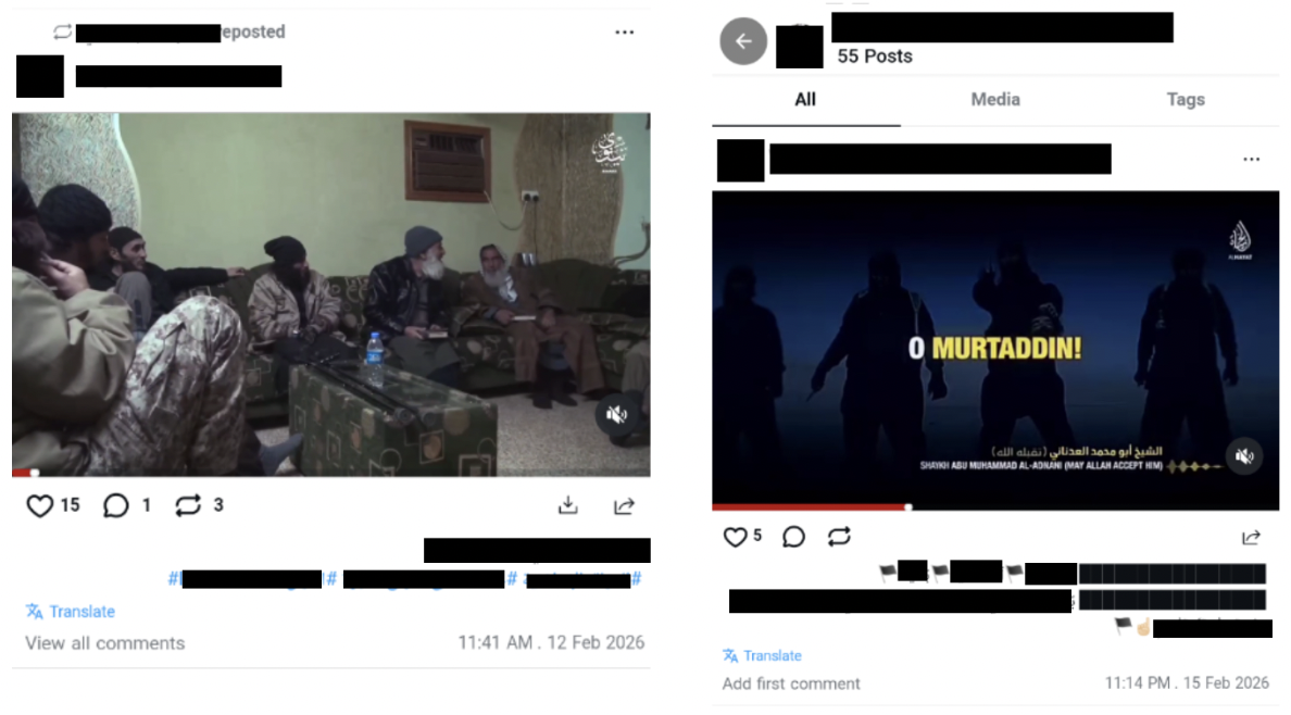 Lastly, pro-IS users on UpScrolled have been observed disseminating a range of IS-related propaganda, including institutional and Ansar Production audiovisual material as well as so-called “non-branded” propaganda (Figure 7).