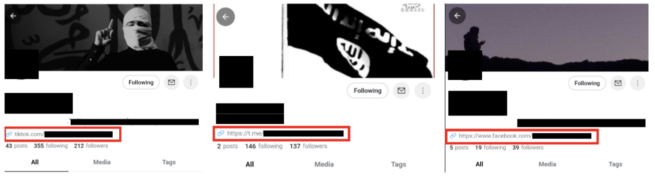 Cross-platform activity is also present on UpScrolled, with some pro-IS UpScrolled users sharing outlinks to active accounts on alternate platforms, such as TikTok, Telegram, and Facebook (Figure 8).