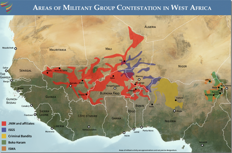 Figure 3: AQ-aligned JNIM (red) has expanded rapidly since its 2017 formation, controlling more territory in the Sahel than all other militant groups in the region combined.