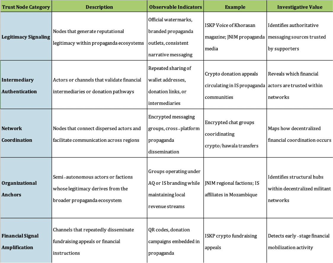 Viewed through this lens, propaganda ecosystems function not only as ideological or recruitment platforms but also as trust infrastructures that authenticate intermediaries and enable financial coordination. Within these ecosystems, certain actors, channels, or accounts serve as trust nodes—points within the network that signal legitimacy, validate intermediaries, and facilitate coordination among otherwise disconnected participants. Recent assessments by the Financial Action Task Force (FATF) reinforce this dynamic, noting that groups such as ISKP increasingly embed crowdfunding appeals directly within propaganda ecosystems, including encrypted messaging channels targeting diaspora communities.
