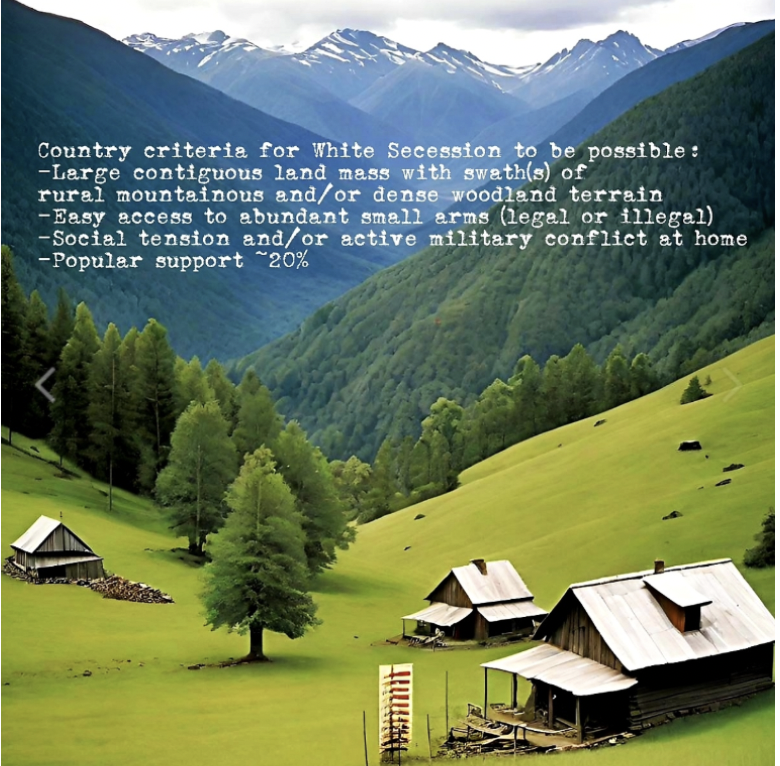 The ideological framework of The Base emphasises that it is impossible to “save” all nations, and that efforts should therefore concentrate on establishing a single territorial stronghold to serve as a base for future expansion. According to the group’s leader, creating this ethno-state requires a relatively large contiguous landmass that includes at least one substantial area of rugged wilderness, ready access to firearms, whether obtained legally or illegally, and ongoing civil unrest or military conflict within its territory. These conditions are envisioned primarily within “traditionally White nations” with at least 20% of support from the local population.