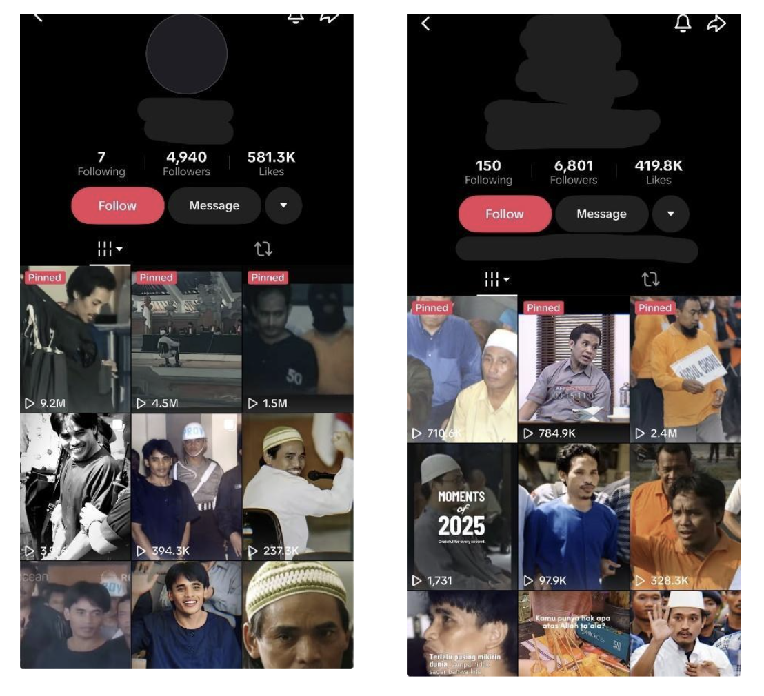 Two accounts observed during the research period, between December 2025 and February 2026, were identified by searching TikTok using the names of prominent JI figures as keywords. Accounts were selected for analysis based on their consistent production of edited content featuring these individuals and their relatively high engagement metrics. These two accounts illustrate how edited footage of JI figures circulates through broad entertainment formats, such as the TikTok For You Page, rather than explicit ideological channels. Account A, which had accumulated approximately 4,940 followers and more than 581,300 likes at the time of observation, regularly shares short-form edits featuring former JI figures set to cinematic transitions and emotionally evocative sound templates. Account B, with approximately 6,801 followers and around 419,800 likes, operates in a similar format, though its content tends to open with humorous or meme-style framing before transitioning into edited archival footage.