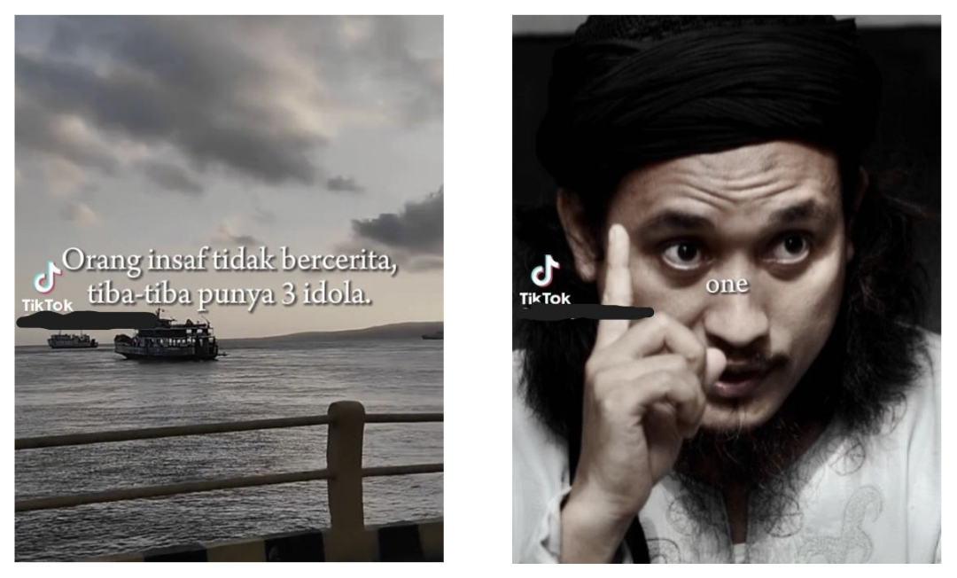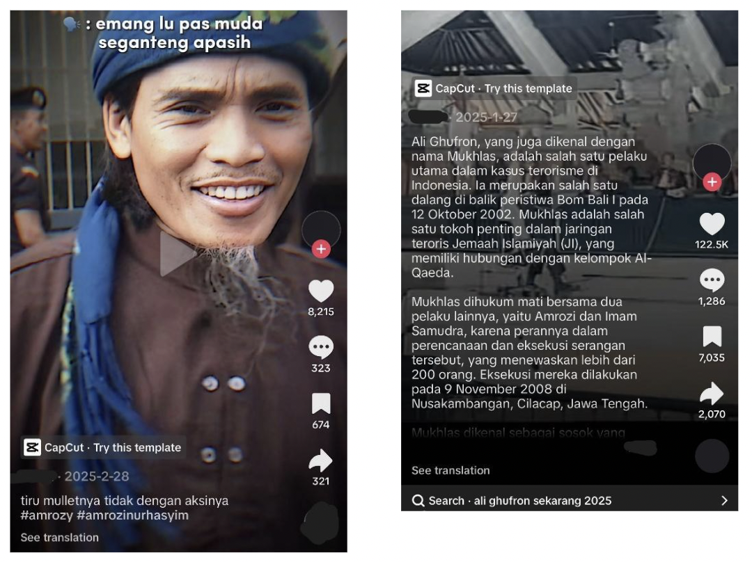 Figure 2. Left: Meme-style edit of Amrozi using nostalgic humour framing. Right: Biographical narration of Ali Ghufron embedded within a TikTok edit.