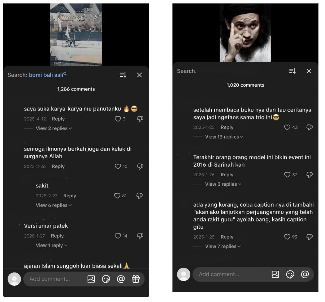Under Account B’s content, one commenter writes: “After reading the book and knowing their story, I became a fan of this trio.” Another references the 2016 Sarinah attack in Jakarta, connecting archival JI figures to more recent incidents in a casual tone. A third user suggests adding a caption reading “I will continue the struggle you have built, teacher,” indicating active participation in the narrative framing. The cumulative effect of these overlapping responses confirms that when “Jedag Jedug” is co-opted for extremist content, it does not merely generate passive viewership; it actively cultivates emotional identification with individuals convicted of mass murder.